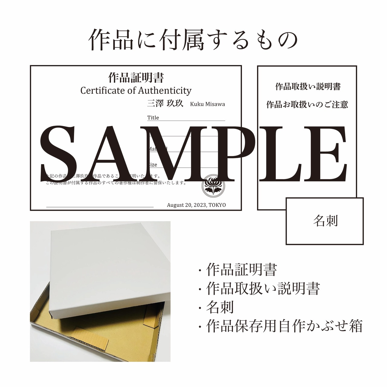 作品証明書、取扱い説明書、名刺、自作かぶせ箱が付属します。
